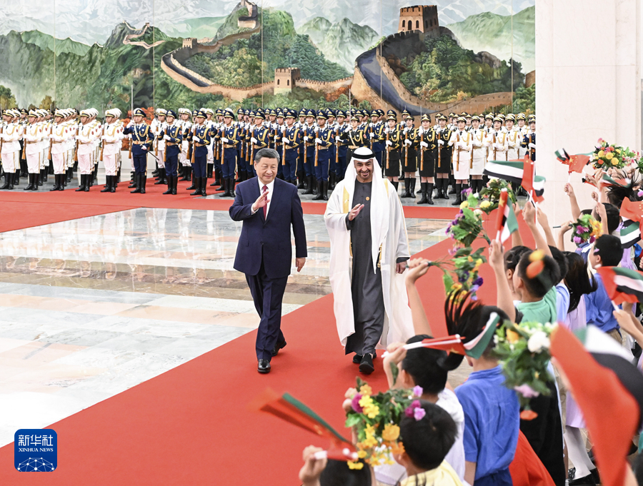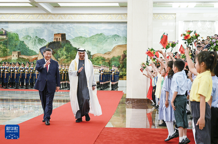 5月(yue)30日下午,國家主(zhu)席習近平在北(bei)京人民大會堂同來華(hua)國(guo)事訪問(wen)并(bing)出席中國-阿拉伯國家合作論壇第十屆部長級會議開(kai)幕式的阿聯(lián)酋(qiu)總(zong)統(tǒng)穆罕默德舉行會談。這是會(hui)談前,習近平在人民大會(hui)堂北大廳為(wei)穆罕默德(de)舉行歡(huan)迎儀(yi)式。新華社記者 饒愛民 攝