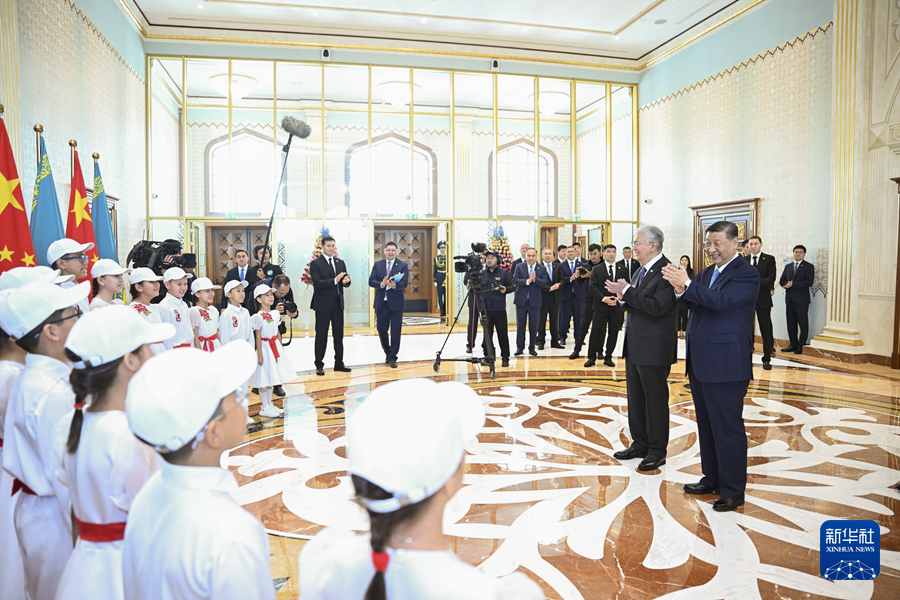 當(dāng)?shù)貢r(shí)間7月2日中午,國(guó)(guo)家(jia)主席(xi)習(xí)近平乘專機(jī)抵(di)達(dá)阿斯塔納,出席上海合作組(zu)織成員國(guó)元首理事會(huì)第二十四次會(huì)議,應(yīng)(ying)哈薩克斯坦共和國(guó)總(zong)統(tǒng)(tong)托卡(ka)耶夫邀請(qǐng),對(duì)(dui)哈薩(sa)克斯坦(tan)進(jìn)行國(guó)事訪問。托卡耶夫在機(jī)場(chǎng)為習(xí)近平舉行盛大隆重的迎賓儀式,十余名哈(ha)薩克斯(si)坦少年兒童用中文演唱《歌唱祖國(guó)》。新華社記者 謝環(huán)馳 攝