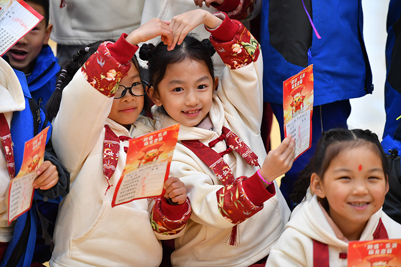 在湖南省長(zhǎng)沙市天心區(qū)的湖南師大附中雙語(yǔ)實(shí)驗(yàn)學(xué)校,一年級(jí)學(xué)生在(zai)趣味(wei)闖關(guān)活動(dòng)中(zhong)展示自己的(de)闖關(guān)卡片(2024年1月18日攝)。新華社記者 陳(chen)澤國(guó) 攝
