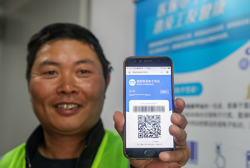 來(lái)自安徽(hui)的農(nóng)民工(gong)王(wang)亞平展示(shi)已激活的醫(yī)保電子(zi)憑(ping)證(2020年10月20日攝(she))。新(xin)華社記者 丁汀 攝