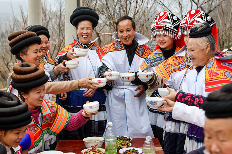 在(zai)位于烏蒙山區(qū)腹地(di)的貴州(zhou)省畢節(jié)市納雍縣,苗族村民馬雍(右五)與妻子(zi)黃國(guó)(guo)琴(左(zuo)五)在年夜(ye)飯上(shang)與大家干杯(2021年2月(yue)11日攝)。新華社記者 歐東衢 攝(she)