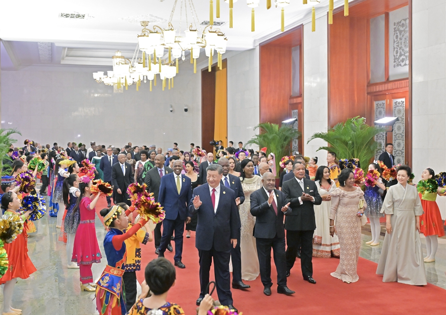 宴會后,習(xí)近平和彭麗媛同貴賓們共同觀看《攜手同行,共(gong)筑未來》文藝演(yan)出。演出展(zhan)現(xiàn)(xian)了中非多(duo)彩文(wen)明美美與共、中非人(ren)民相知相親,贏得陣陣熱烈掌聲。
