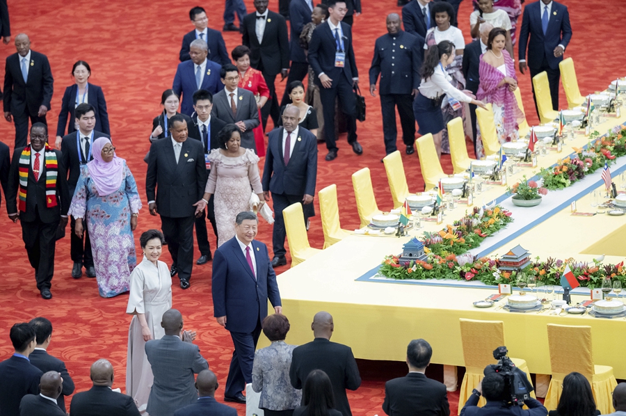 9月4日晚,國(guo)家主席習(xí)(xi)近平和夫人彭麗媛在北京人民大會堂舉行宴會,歡迎(ying)來(lai)華出席中非合作論壇北京峰會的非(fei)方及(ji)國(guo)際貴賓。這是習(xí)近平和彭麗媛同(tong)貴賓們共同步入宴會廳。新華社記者 劉彬 攝