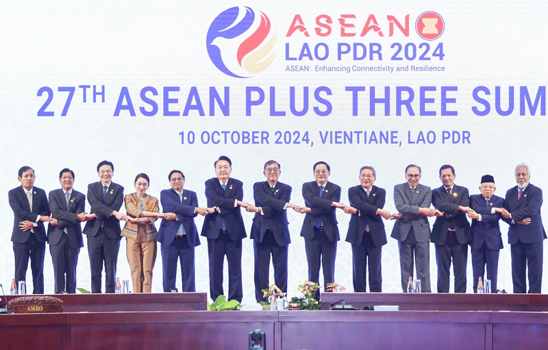 當?shù)貢r間10月10日,國務(wù)院(yuan)總理李強在老撾萬象出席第27次東(dong)盟與(yu)中日韓(10+3)領(lǐng)導(dǎo)人會議。這是會前(qian)集體合影。新華社記者 劉彬 攝