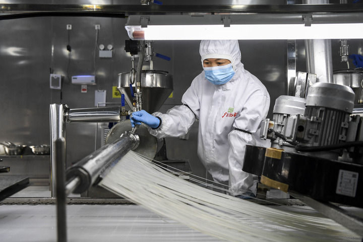 在廣西柳州市一家螺(luo)螄(si)粉生產(chǎn)企業(yè),工作人員在查看米粉的生(sheng)產(chǎn)情況(2024年12月13日攝)。新華社記者 曹(cao)祎銘 攝