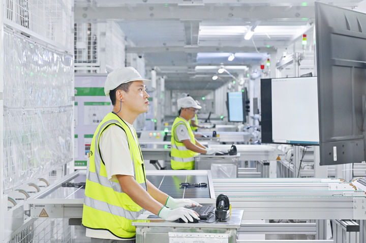 工人在(zai)位于浙江省樂清市的正泰(tai)集團(tuán)8GW高效光伏組件生產(chǎn)基地工作(資料照片)。新華社發(fā)(fa)