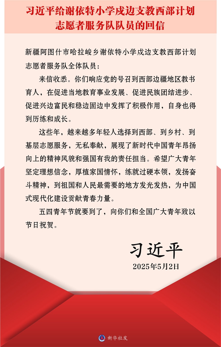 新(xin)華社北京5月3日電? 在五四青(qing)年節(jié)到來(lái)之際,中共中央總書記、國(guó)家主席、中央軍委主席習(xí)近平給新(xin)疆克孜勒蘇(su)柯?tīng)柨俗?zi)自治州阿圖什市哈拉峻(jun)鄉(xiāng)謝依特小學(xué)戍邊支教西部計(jì)劃志愿者服務(wù)隊(duì)全體隊(duì)員(yuan)回信,向(xiang)全國(guó)廣大青(qing)年(nian)致以節(jié)日祝賀并提出殷切期望(wang)。