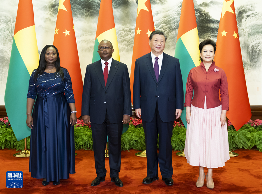 7月10日下午,國家主席習(xí)近(jin)平在北京人民大會堂(tang)同來華進(jìn)行國事訪問的幾(ji)內(nèi)亞比(bi)紹總統(tǒng)恩巴洛舉行會談。這是會談前,習(xí)近平和夫人彭麗媛同恩巴洛和(he)夫人迪尼西婭合影。新華(hua)社記者 黃敬文 攝